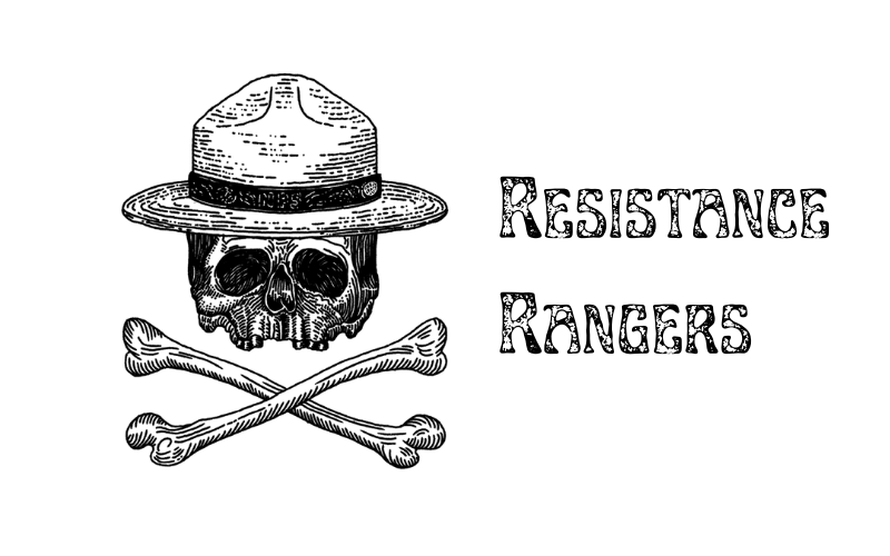 • Line drawing of a federal park ranger with a mountain range and waterfall in the background.
